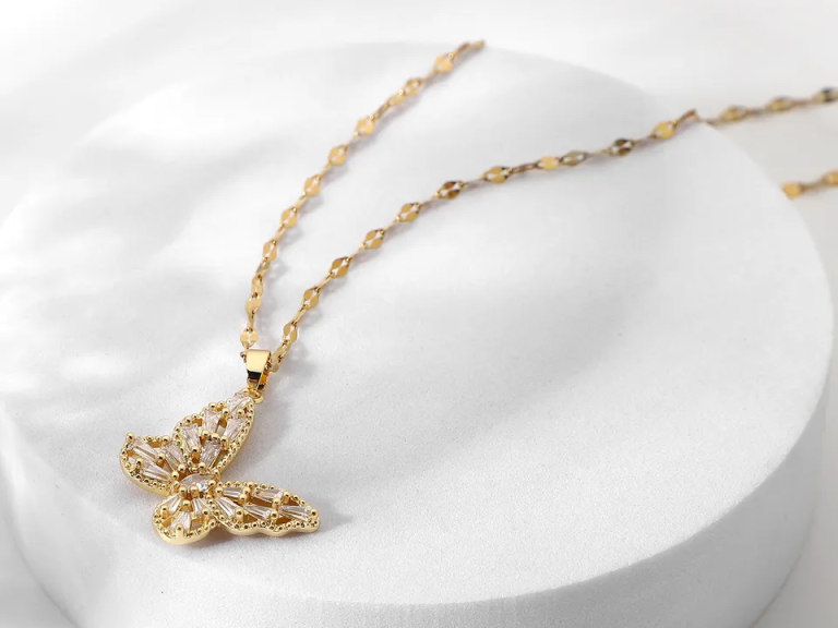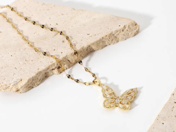 Die mit 18K Gold veredelte Schmetterlingskette fängt die Leichtigkeit der Natur in filigranen Details ein. Strahlende Zirkonia-Steine betonen die Eleganz der Flügel, während die zarte Kette den Anhänger perfekt inszeniert. Ein Schmuckstück von zeitloser Schönheit – für Sie oder einen besonderen Menschen.